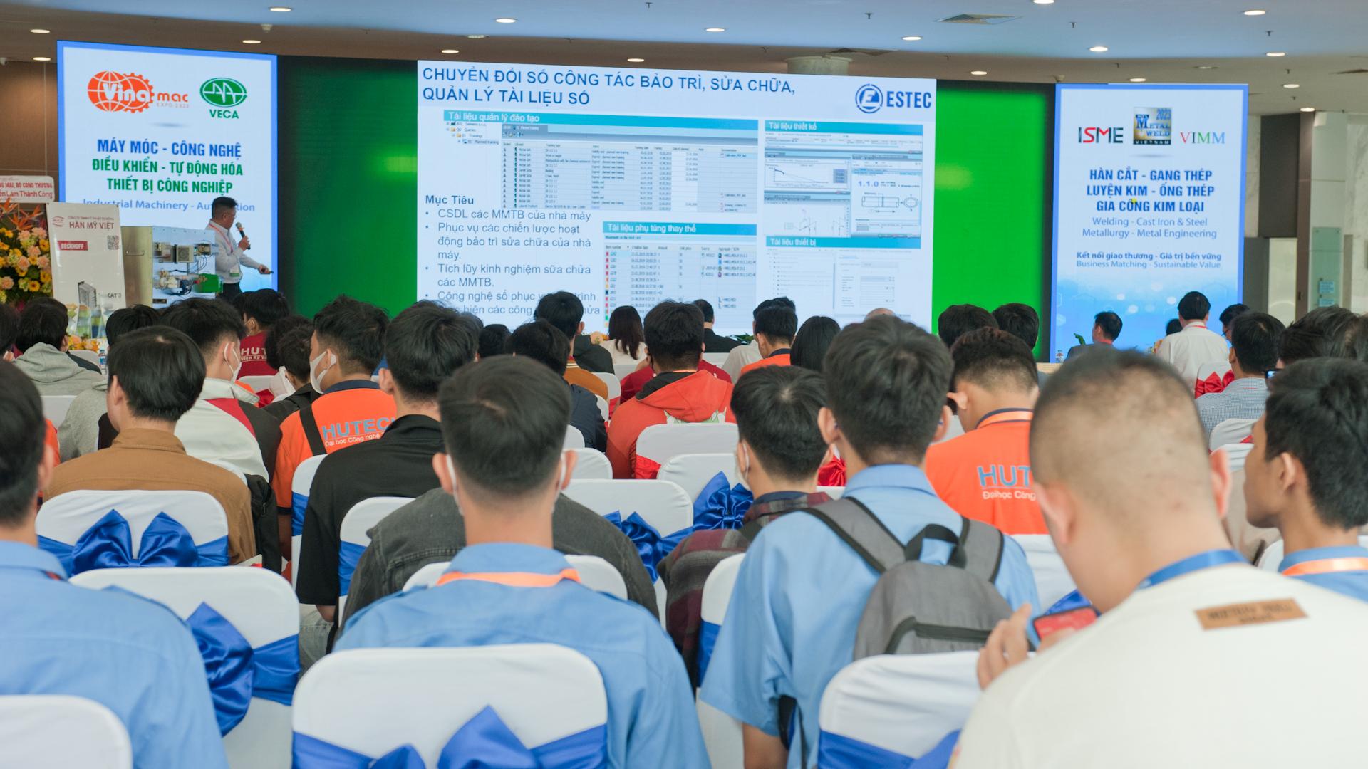 Trong khuôn khổ sự kiện, ESTEC đã có dịp gặp gỡ khách hàng thông qua buổi hội thảo công nghệ với chuyên đề “Nền tảng chuyển đổi số doanh nghiệp giải pháp quản trị hệ thống sản xuất, quản trị bảo trì sửa chữa và tài liệu kỹ thuật”. Tại đây các Khách hàng đã được chuyên gia của chúng tôi trình bày và giải đáp các thắc mắc về các vấn đề xoay quanh việc áp dụng các giải pháp số trong mô hình quản trị vận hành sản xuất quy trình.